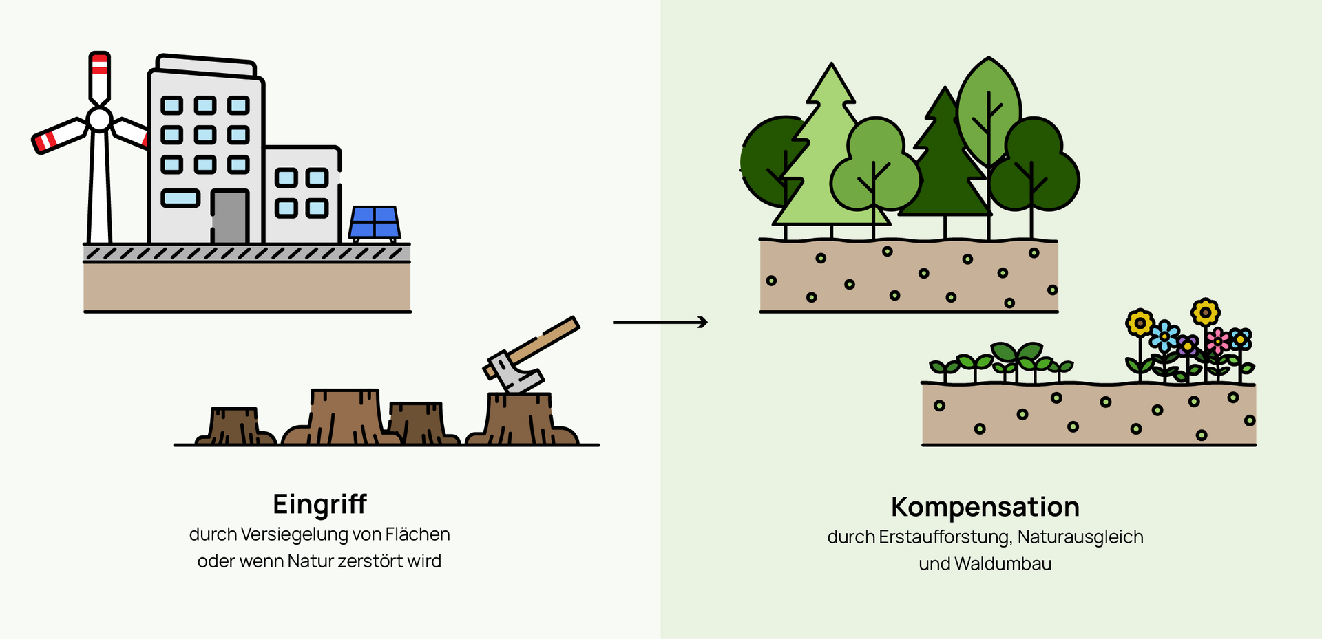 Wer durch Bau- oder Nutzungsprojekte in die Natur beziehungsweise Landschaft eingreift, ist gesetzlich verpflichtet, entstandene Schäden auszugleichen. Solche Eingriffe können zum Beispiel durch Infrastrukturprojekte, Industrieanlagen oder den Bau von Windparks und Solaranlagen entstehen. Dabei gilt das sogenannte Verursacherprinzip: Unvermeidbare Beeinträchtigungen der Natur und Landschaft müssen durch geeignete Maßnahmen wiederhergestellt oder ersetzt werden.
